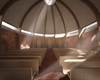 The main feature of the church is its large, round church hall with a central dome. The deliberately introvert volume takes in daylight from above avoiding openings in the façade. The lack of openings in the facade enables the visitor to start an inner spiritual journey without distraction from the residential neighbourhood. The windowless facades also enhance the sculptural feature of the building and emphasizes the rough materiality of the red concrete. The dome is made of a copper like metal amidst green roofs.