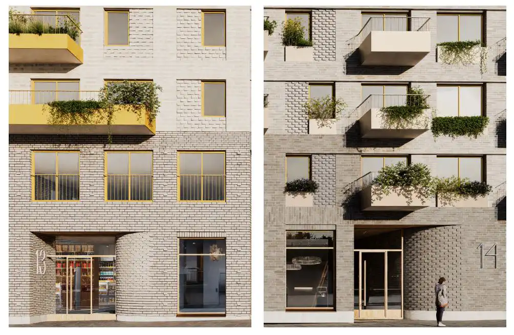 Along the streets, façades of reused brick provide a solid urban presence, with variations in masonry and colour referencing the area’s material history. Facing the courtyard, the architecture shifts to timber and greenery, introducing a warmer and more intimate residential scale.